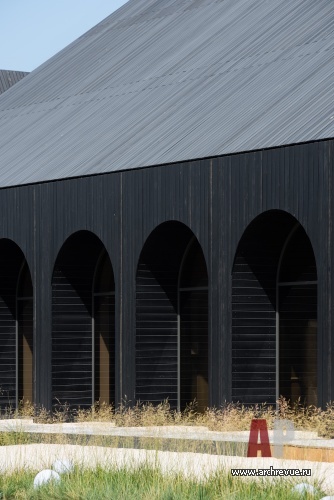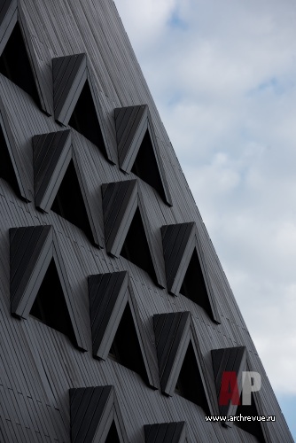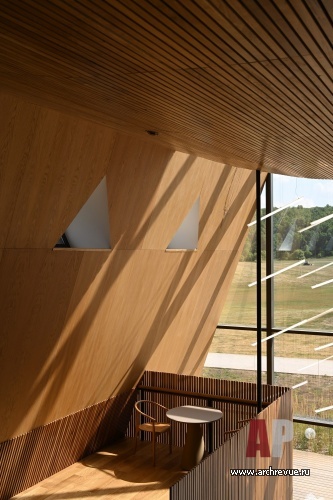 Комплекс зданий Центра гостеприимства находится на отправной точке кругового маршрута, при входе с общественной парковки. Отсюда начинается движение по парку, а постройки помогают лучше ориентироваться на местности и любоваться наиболее эффектными видами. Разновысотное блоки складываются в своего рода цепочку, у каждого из них своя архитектурная пластика и функциональная наполненность.