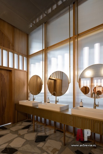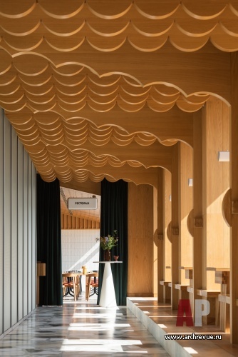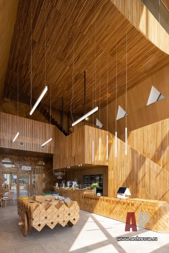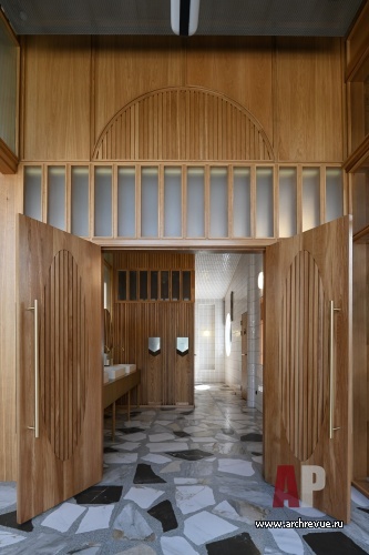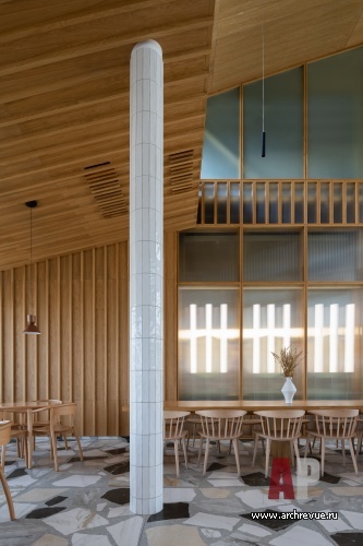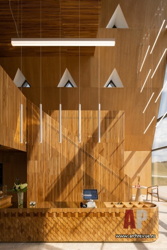 С темными лаконичными и отчасти брутальными фасадами контрастируют интерьеры из светлого дерева: светлые, легкие, тонко орнаментированные. Внутри – словно ларец с драгоценностями: деревянное кружево, пояса богатых узоров по стенам, теплая глазурованная плитка, состаренная брусчатка. Обшивка стен тонкими рейками, деревянные зигзаги в декоре поверхностей и «чешуя» на стойке ресепшен складываются в причудливый рисунок с отсылками к архитектурным приемам из различных эпох Руси и архитектуры СССР, которые переосмыслены и скомпилированы в новую эстетику.