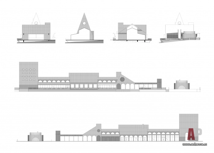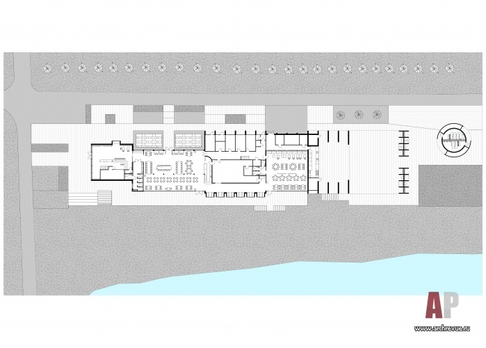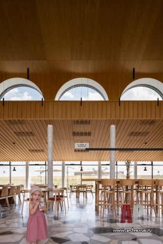 Первый, самый высокий объем («Гора») включает входную группу с лобби. Далее расположен двусветный объем кафе («Изба»), за ним – более камерный ресторан, а в конце – площадка с арочными проходами для стритфуда, которая перетекает в открытую террасу – идеальную для еды, общения и мероприятий. Завершает комплекс здание круглого туалета. Благодаря множеству отдельных входов с улицы, каждый блок может работать автономно и отделяться от соседних. Высокая стилобатная часть отдана под технические и складские пространства и частично спрятана в рельеф. А вокруг – поля, берег реки и сказочные артефакты, которые превратят семейные выходные в увлекательный поход в Тридевятое царство.