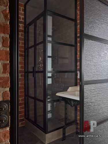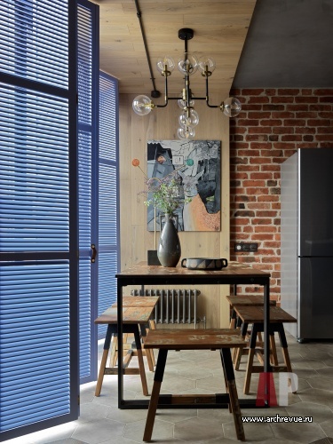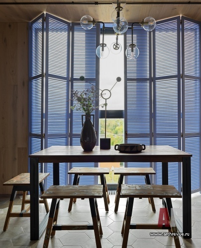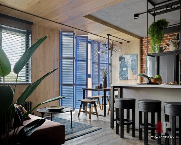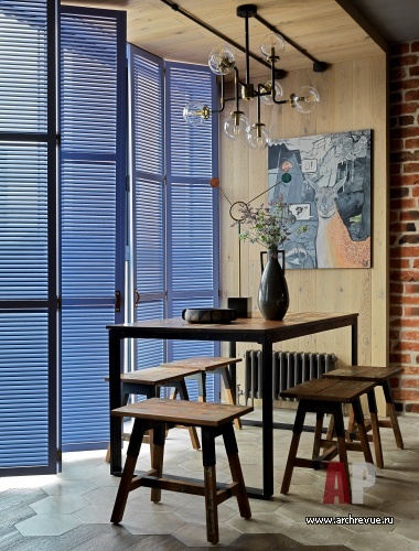 В поддержку к кирпичу и дереву дизайнер использовала типичные лофтовые материалы: черный металл, стекло (тонированное и рифленое) и бетон. А, чтобы смягчить брутальность и добавить ассоциаций с загородным отдыхом, придумала деревянные ставни цвета лаванды. Они подчеркивают геометрию пространства, акцентируют панорамное окно и в то же время защищают от солнца и шумной городской среды.