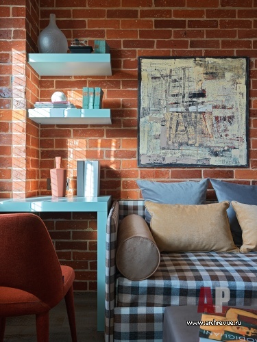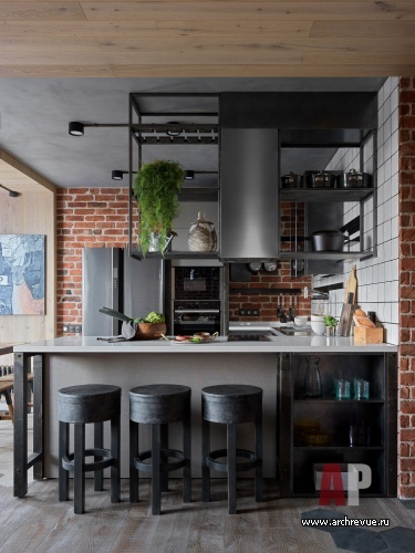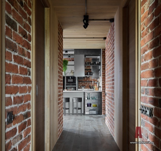 Основная идея интерьера – соединение урбанистических элементов с уютными и теплыми текстурами, характерными для загородного жилья. По сути в пространстве два акцентных материала: красный кирпич в облицовке стен и светлое натуральное дерево.