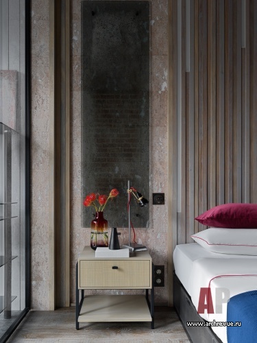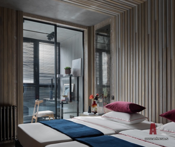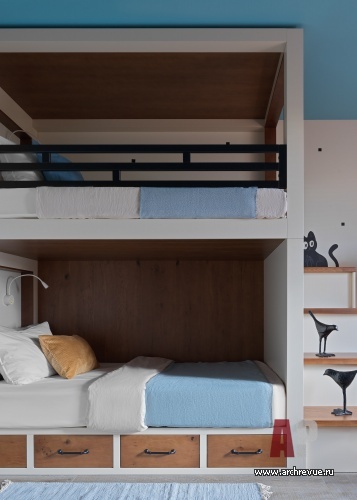 В противовес общественной части приватная зона получилась менее активной по цветам и фактурам. В хозяйской спальне на стенах использовано нейтральное пробковое покрытие, реечные панели и состаренные зеркала. Детская напоминает солнечный летний двор, а гостевая спальня – прогретую солнцем дачную террасу.