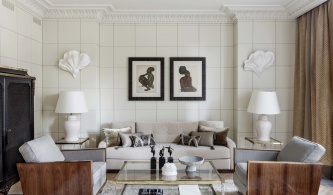 Гостиная диван, лежанка, кресло Pierre Frey; кофейные столики, круглый стол, стеллаж Henge