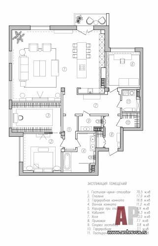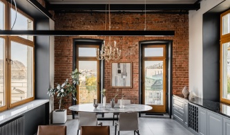 Главная особенность квартиры – великолепный вид на Смольный собор и парк. Чтобы усилить парадный настрой интерьера, общую зону дизайнеры ориентировали на роскошную панораму: она отлично просматривается как из столовой, так и с диванной группы. Уменьшение большого нерационального холла позволило увеличить кухню, разместить в ней обеденный стол и значительно улучшить пропорции гостевого пространства.