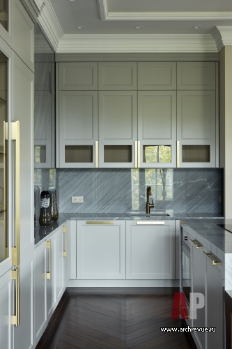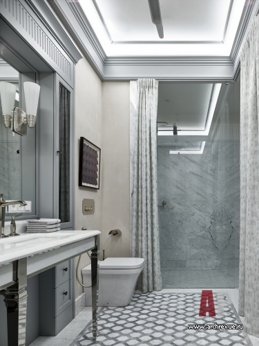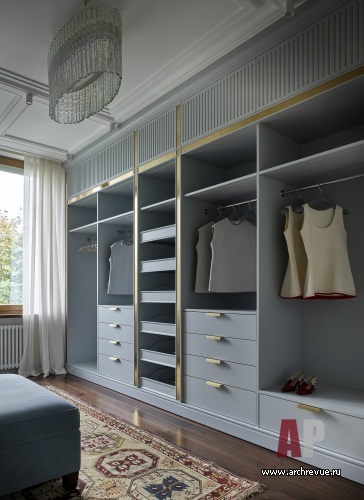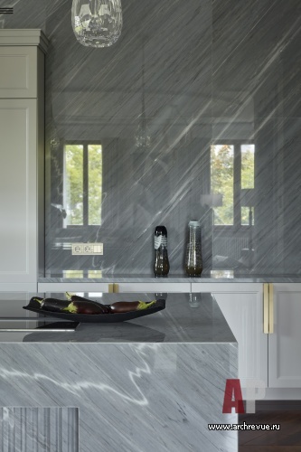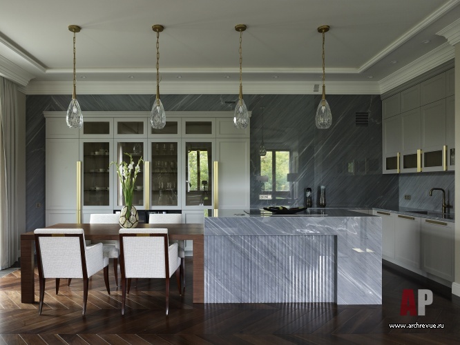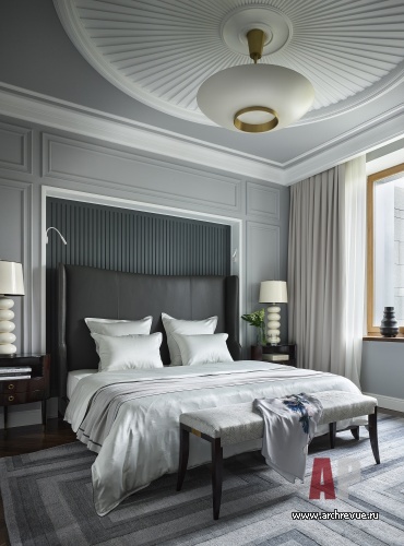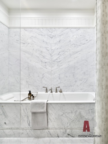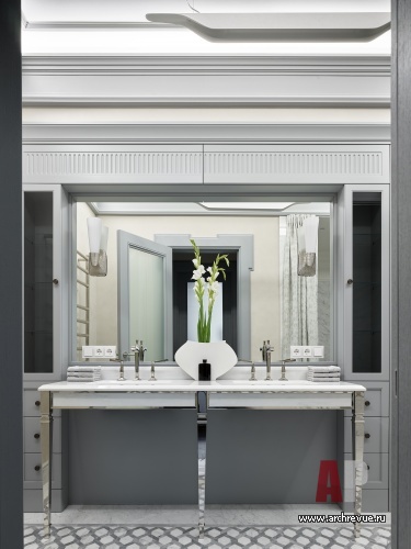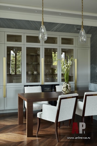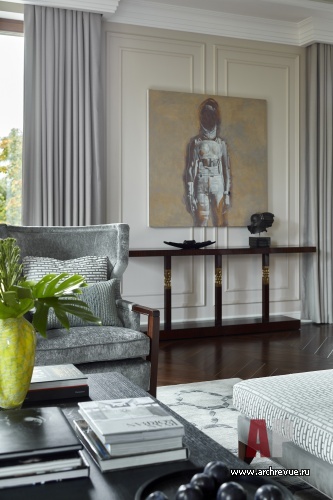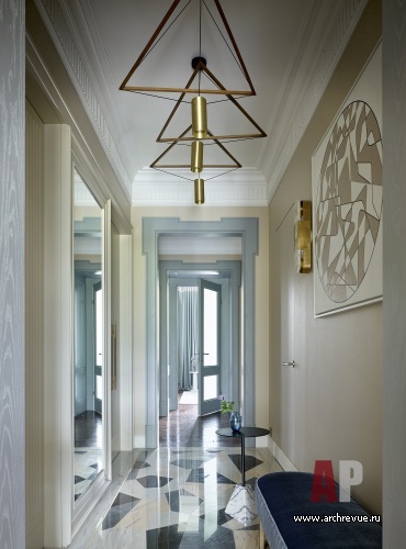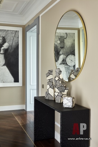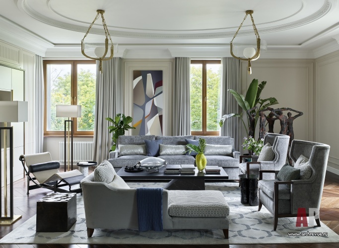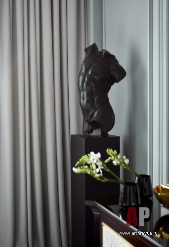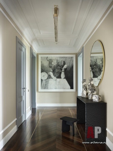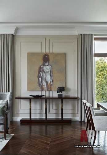При оформлении квартиры дизайнеры соединили классические элементы, минималистичный дизайн и современное искусство. За основу взяли традиционную канву: лепной карнизы и молдинги из гипса, паркет с укладкой «французская елка» из древесины американского ореха с долговечным покрытием, филенчатые межкомнатные двери… «Мы выбирали благородные фактуры и тактильные материалы, чтобы к ним было приятно прикасаться. Поэтому здесь много натурального дерева, камня, латуни, тактильного текстиля – бархата, шерсти, шелка, египетского хлопка. Классический фон разбавили современной американской мебелью и предметами коллекционного дизайна», - отмечают авторы проекта.