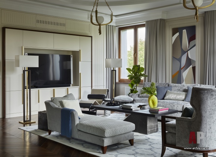 Гостиная диван, кресла, кушетка Baker, кресло-шезлонг Cassina, столик La Chance, консоль Theodore Alexander; корпусная ТВ-мебель, на заказ