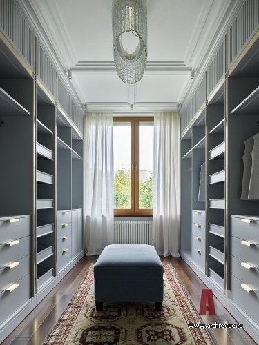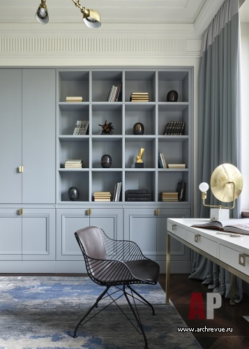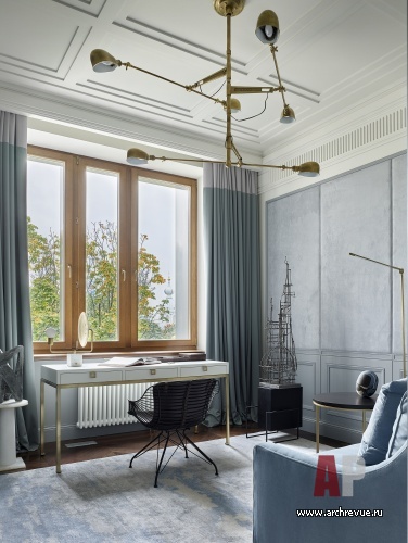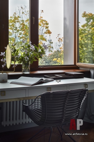 Небольшой буферный коридор авторы проекта сохранили, он ведет на приватную территорию с видом на тихий парк и включает спальню, просторную гардеробную с окном и ванную комнату. Кабинет примыкает к гостиной с парадной панорамой, и, сидя за рабочим столом, можно созерцать позолоченные купола собора.