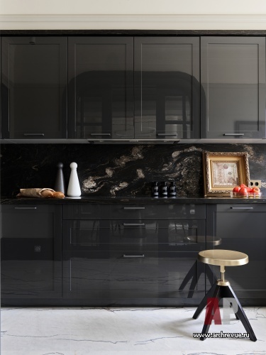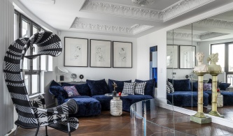 Интерьер оформлен как единое целое: лепные карнизы «вырастают» из стеновых панелей, формируя красивые своды, шкафы утоплены в стены и даже ТВ-экран спрятан в тумбу. Он управляется с пульта, либо голосом и «по команде» просто выезжает вверх. С белой гостиной контрастирует черная кухня, а все помещения связывает воедино декор и фурнитура из латуни.