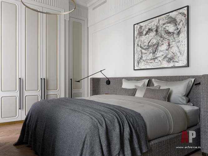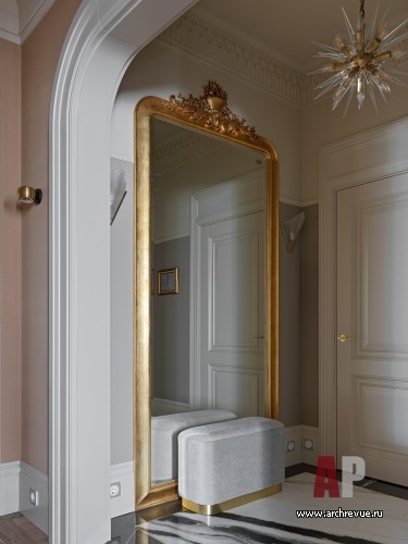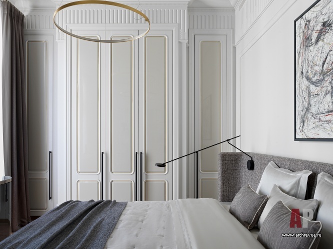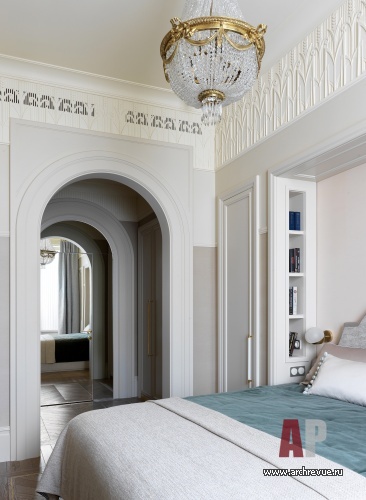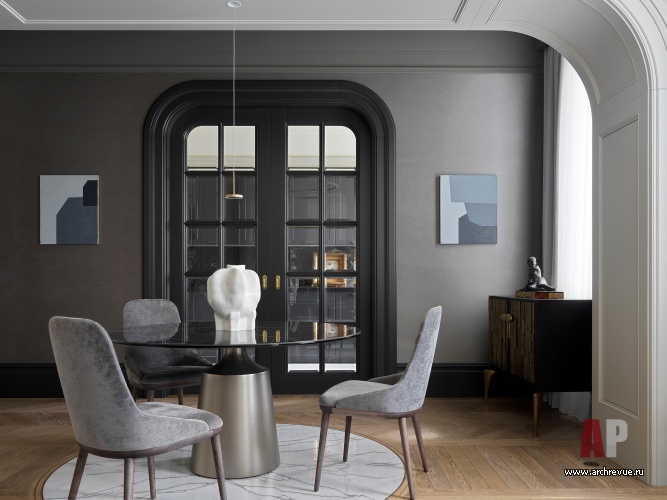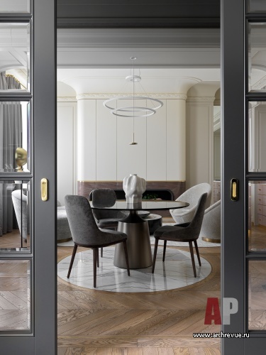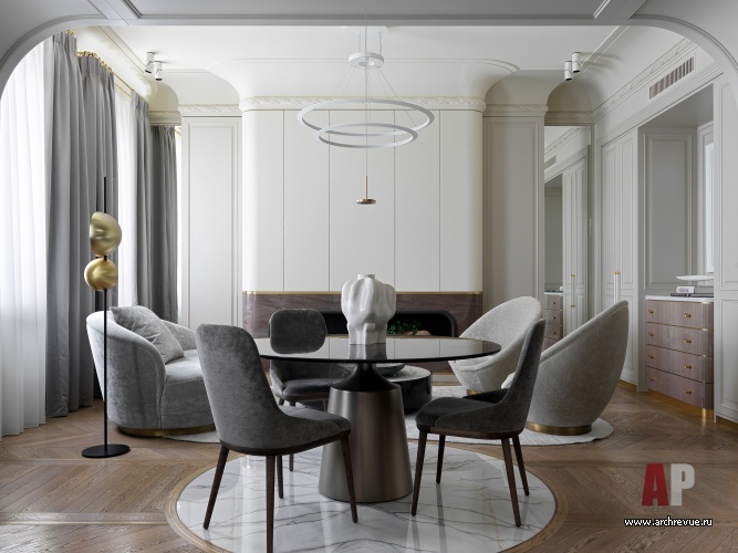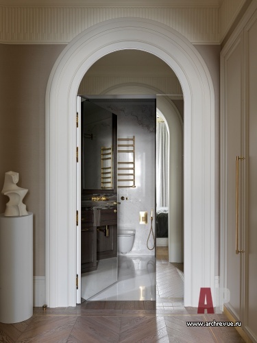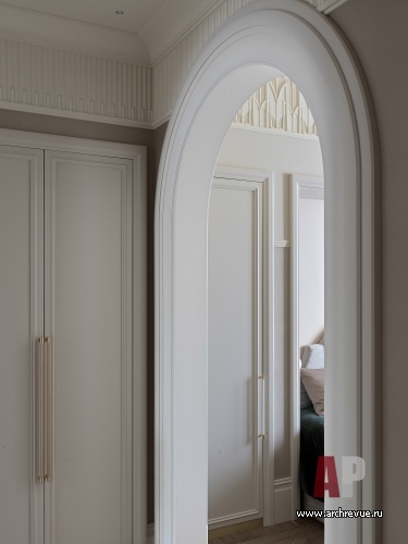 Стилистическое наполнение квартиры отсылает к традиционным интерьерам, но не перегруженным подробностями и музейными деталями, а легким, светлым, просторным. От классики здесь арочные конструкции и скругленные формы, высокие лепные гипсовые карнизы, двери с филенками и фацетными стеклами, паркет-«елочка», панели-буазери. Но все эти элементы предельно лаконичные, точные, крупного масштаба, соответствующие внушительным объемам пространства.