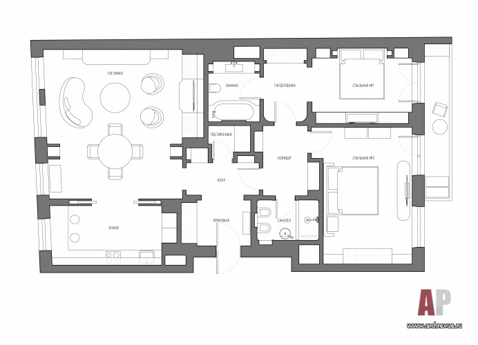 Исходную планировку дизайнеры полностью переработали, выбрав осевую схему построения пространства с четким разделением на общественную и приватную зоны и красивыми перспективами. Центральный холл делит квартиру на два блока: в левом крыле находится гостиная-столовая и кухня, в правом – две спальни для каждого из супругов (одна из них с собственным санузлом), по центру – второй санузел и постирочная. Второй санузел при необходимости может выполнять роль гостевого, а спальни объединены между собой не только внутренним холлом, но и общим балконом.