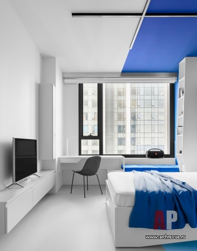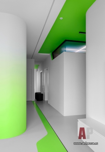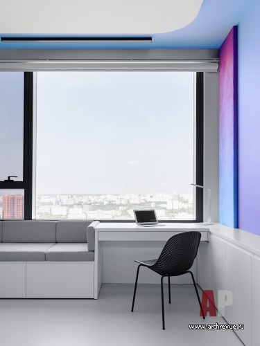 Это преимущество было подчеркнуто в дизайне: почти все окна задействованы как видовые точки, а фон сделан максимально нейтральным. Белое пространство пронзает цветовой градиент, который превращает функциональную московскую квартиру в пространство компьютерной игры, футуристическую киберреальность.