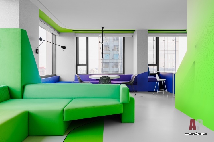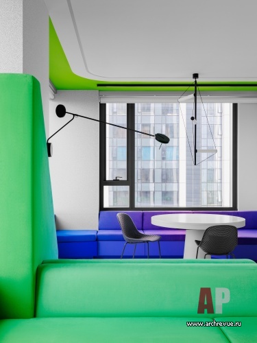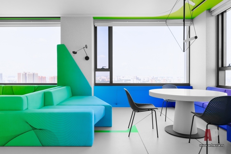 Активный цветовой рисунок поддерживает геометрия пространства: обтекаемых форм мебель, скругленные стены, плавные линии потолков и декор наливных полов. Геометрический паттерн отсылает к работам художников-супрематистов, в частности к знаменитой тройке К. Малевича «круг-квадрат-крест».