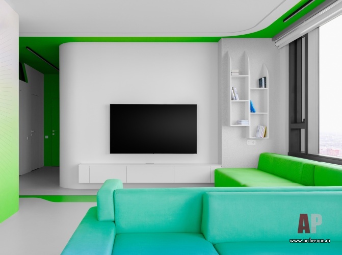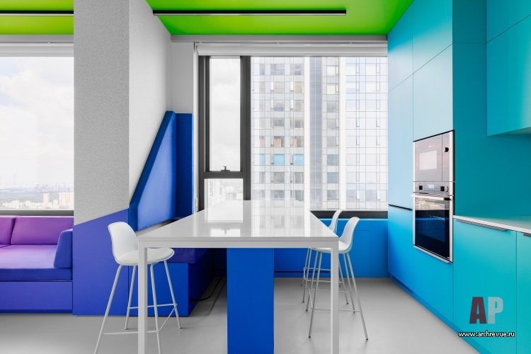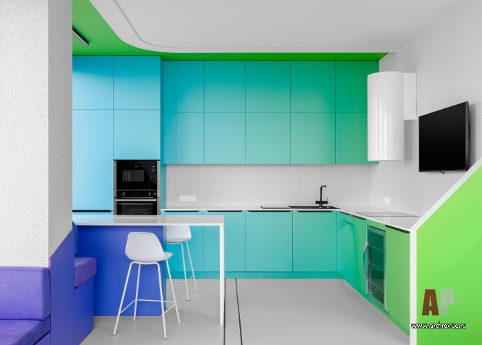 Интерьер квартиры выполнен в современном лаконичном стиле, его яркая доминанта – цветовой градиент: непрерывная линия зеленых, бирюзовых, синих и фиолетовых оттенков. Звонкие, неоновые цвета плавным потоком вливаются в помещения и объединяют их. Растяжка по цвету присутствует в оформлении мягкой мебели, фасадах встроенных шкафов и кухонного гарнитура, композитных стеновых панелях и декоративной окраске стен.