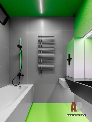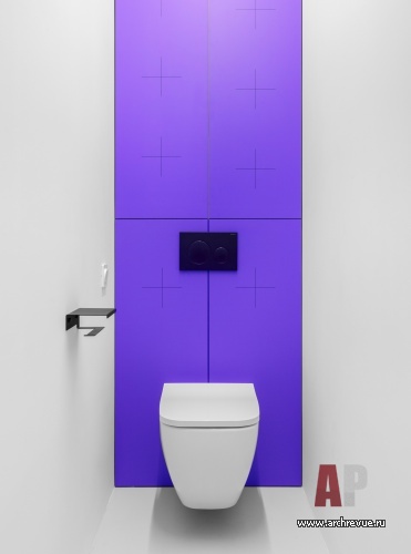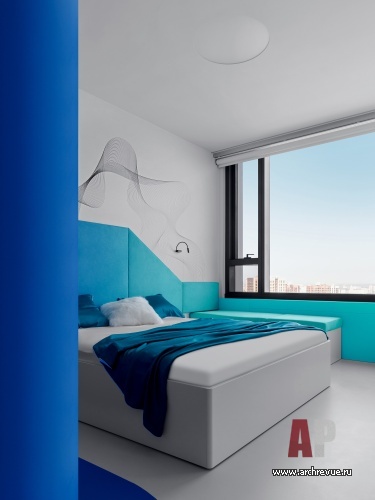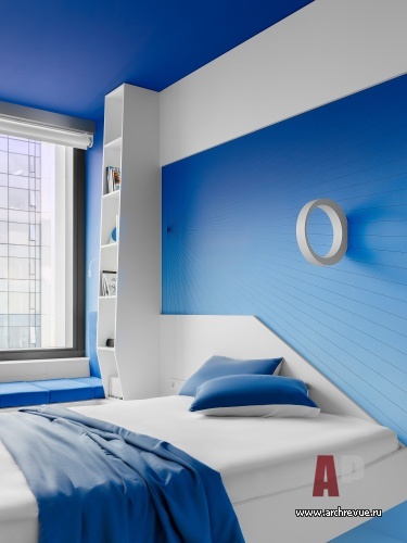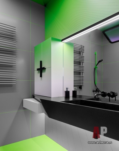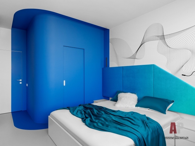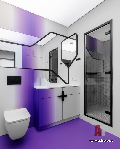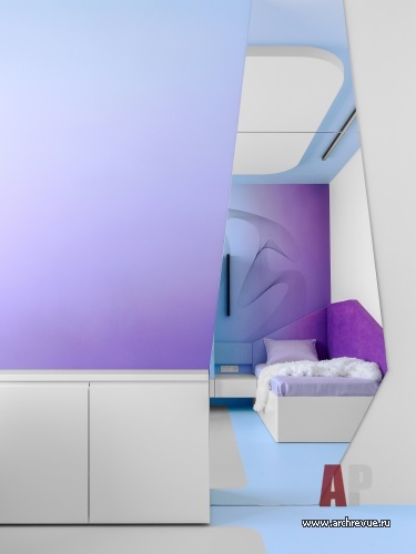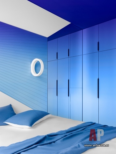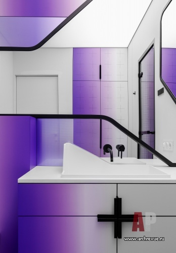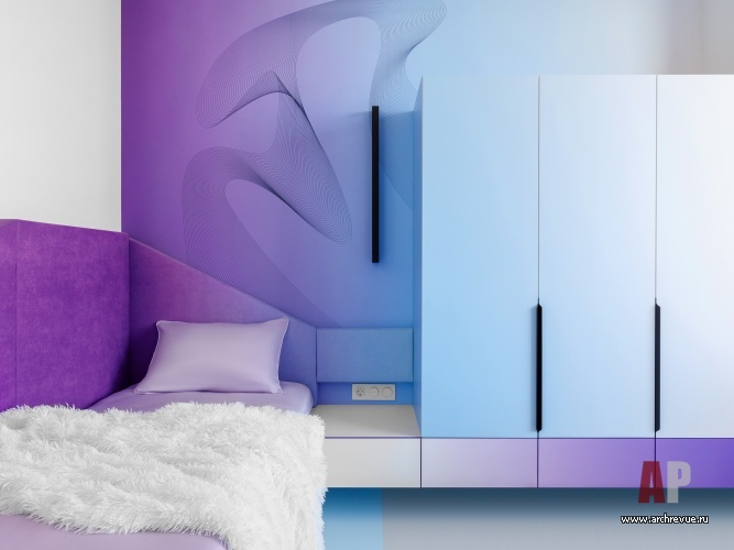 Она усложняет объем, дает глубину. «Композитные панели мы использовали в помещениях с повышенной влажностью и в отделке экранов радиаторов. Фасады корпусной мебели выполнили из МДФ с ультрафиолетовой печатью и лаком. Изначально мы планировали использовать панели на всех стенах, где есть градиент, но в процессе реализации решили в жилых помещениях нанести градиент художественной краской, а графичный рисунок – роботизированной печатью», - рассказывает автор проекта.
