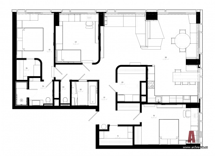 Изначально квартира площадью 133 кв. м представляла собой единое пространство с практически свободной планировкой. Ее однозначные преимущества – угловое расположение и семь высоких окон, выходящих на две стороны дома. Это давала много возможностей для грамотного планирования. Архитекторы долго разрабатывали варианты организации пространства, пока не нашли идеально подходящий потребностям заказчиков.