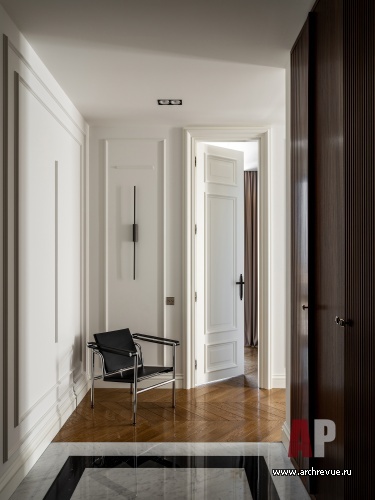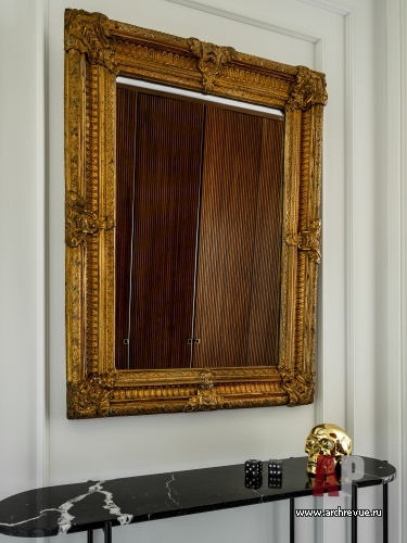 В его основе – старая добрая американская классика: высокие двери с филенками и наличниками, лепные карнизы и молдинги, подчеркивающий высоту широкий плинтус, нейтральная фоновая палитра. И среди всей строгости – яркие акцентные элементы, которые так гармонично подобраны и перекликаются, что создается ощущение арт-объекта, продуманной до мелочей декорации.