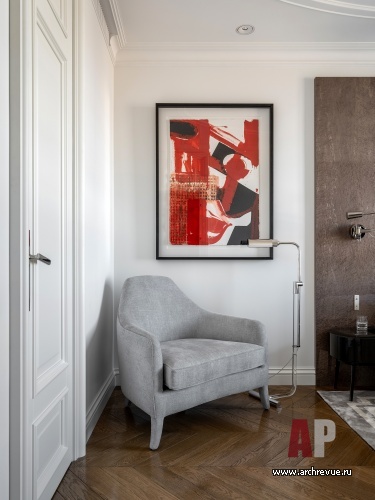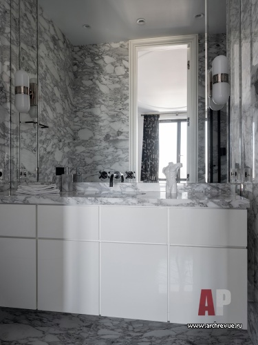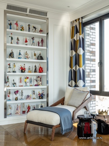 То есть дал полный карт-бланш. Единственное, что он отметил как обязательные элементы – глянцевый пол коньячного оттенка, как в старых французских шато, и возможность достойно представить его коллекцию фарфоровых кукол Lanvin. «Образу жизни заказчика больше всего подходит интерьер роскошный, удобный и со вкусом. Современная американская стилистика, авангардный текстиль Metaphores оказались здесь очень уместны… Вообще, это один из моих любимых проектов. Первый раз мы встретились с заказчиком, когда дом еще не был сдан, а второй – на приемке квартиры. На стройке он не появился ни разу, а после новогодних каникул приехал из Лос-Анджелеса с чемоданом и остался. Как в шикарный отель: цветы стояли в вазах, любимые фотографии в рамках, коллекция кукол расставлена на стеллажах в правильном порядке, постель заправлена», - вспоминает дизайнер. Проектные работы заняли 2 месяца, а ремонтные работы под ключ – 9 месяцев.