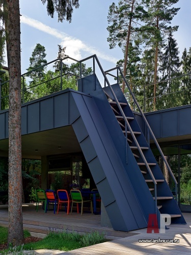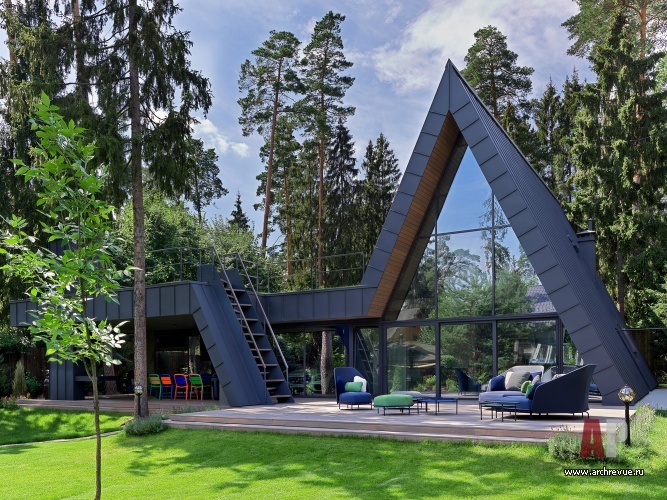 Среди высоких сосен в Подмосковье архитекторы бюро Hôtel Richesse построили треугольный гостевой дом. Его нестандартная и очень образная архитектура – ответ на месторасположение: живописные места на Николиной Горе. «Именно такая легкая конструкция с острой крышей, зоной патио и большой террасой на крыше ассоциируется с ландшафтом Николиной Горы и соответствует историческому духу поселка, где соседи всегда ходили к другу ходили в гости, а на террасах происходили интересные разговоры, встречи, знакомства», - отмечают авторы проекта.