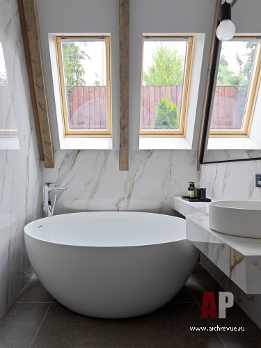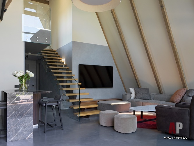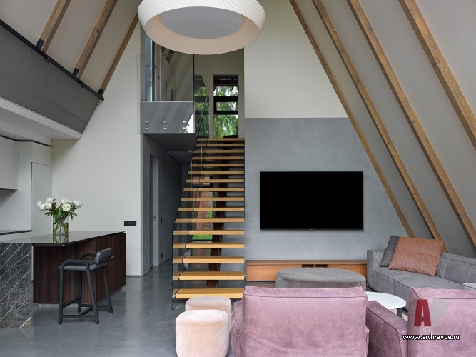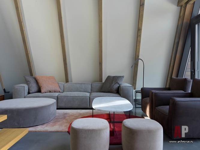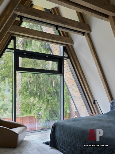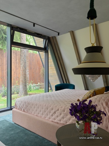 Благодаря панорамным окнам в пол все жилые помещения пронизаны светом. «Из-за необычной формы кровли приходилось все тщательно продумывать, чтобы людям, которые там будут проводить время, было комфортно в любом из помещений. Для каждой комнаты выбиралось лучшее место, расположение мебели подчинено эргономике и удобству передвижения», - отмечают авторы проекта.