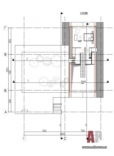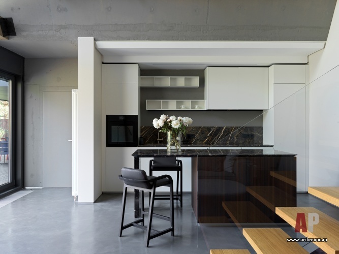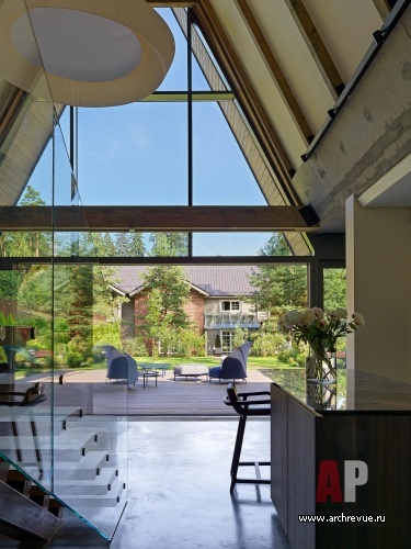 Двухэтажный дом представляет собой монолитную железобетонную конструкцию со стеклянными фасадами, которые работают как большие зеркала, отражая вековые сосны, ухоженный сад с прудом, голубое небо… К стеклянному объему с двухскатной заостренной крышей пристроен бетонный объем гаража. Плоская площадка над ним задумана как парящая терраса с зеленой кровлей. Она визуально увеличивает небольшой объем дома и еще сильнее связывает его с природным ландшафтом. На террасу ведет лестница, обшитая металлом, в конструктивную колонну встроен мангал. Кровля использована фальцевая из темного металла, подкровельное пространство оформлено деревом теплого оттенка.