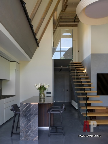 Интерьер задуман как продолжение архитектуры и природной окружающей среды. Помимо использования в отделке натуральных материалов, архитекторы намеренно оставили часть видимых конструктивных решений – стропильные балки, бетонные фрагменты стен, наливные полы – они «заземляют» пространство, делают его комфортным и органичным.