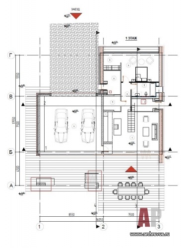 Заказчику изначально нужен был гостевой дом с теплым гаражом, а наличие патио и эксплуатируемой кровли превратило его еще и в место летних вечеринок и семейных мероприятий, точку притяжения друзей семьи.