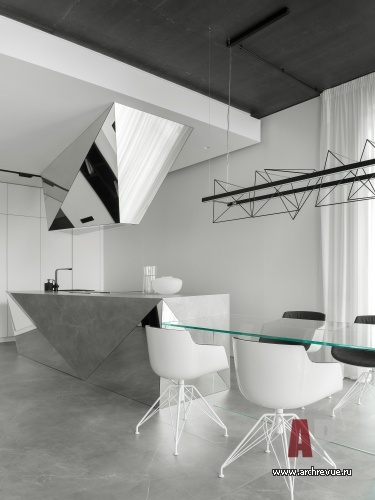 Квартира площадью 159 кв. м создана путем объединения двух соседних квартир. Почти половину от общей площади заняла гостевая зона – открытое пространство гостиной, столовой и кухни. Ее доминанта – кухонный остров-айсберг с ломаными гранями, облицованный керамогранитом и зеркалами.