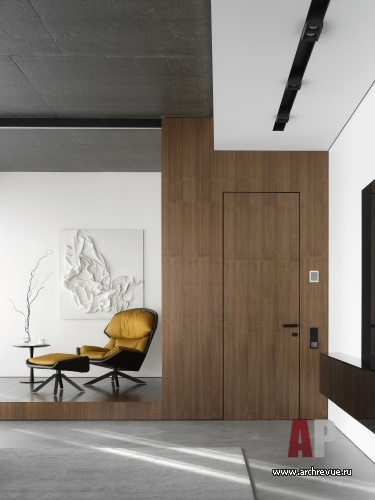 Впечатляющий объем, своего рода арт-объект с огромным функционалом: вытяжкой, варочной панелью, мойкой, шкафами для хранения и светильником. Как часть гостиной решена гостевая комната. «Для полноценной гостевой места не хватало. Нам не хотелось урезать площадь общей зоны, поэтому мы придумали комнату-трансформер. В обычной жизни зона отдыха с уютным креслом расположена на подиуме и визуально объединена с гостиной, но, когда необходимо, из стены, отделанной панелями из ореха, откидывается кровать, а скрытые раздвижные двери превращают этот блок в изолированную гостевую комнату», - рассказывают авторы проекта Майкл и Элен Мирошкины.