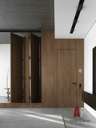 В его облицовке использованы керамогранит и зеркало, отражение в котором меняется в зависимости от точки обзора и создает эффект игры объемов и преломлений света. В остров врезается обеденный стол из стекла. Деревянные панели и подиум из шпона американского ореха выделят гостевую зону- трансформер, в связке с ними изготовлена перегородка, которая убирается в стену, и откидная кровать. В гостиной за черным стеклом спрятан телевизор, а лаконичные кухонные фасады снабжены ножным механизмом открывания.