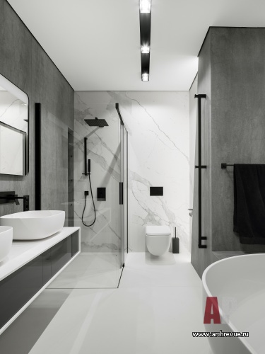 Интерьер оформлен в монохромной палитре, настроение в нем меняется в зависимости от освещения и погоды. Белые стены, серый пол, тонированный бетон, оставленный в зоне гостиной как ключевой момент отделки, зеркала, ломающие и расширяющие объем – вот его основные особенности. В приватных пространствах основная линия сохраняется, но акценты немного смещаются: в хозяйской спальне на первый план выходят вертикальные серые матовые стеновые панели, в детских – оригинальные круглые светильники и удобная встроенная мебель, в главном санузле – будто врезанная в брутальный серый камень округлая парящая ванна.