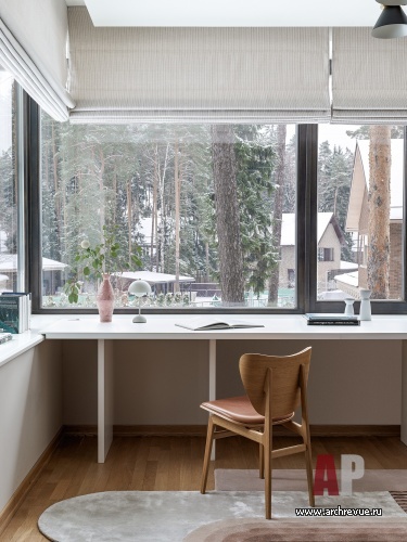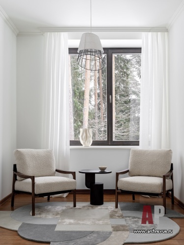 Основной упор в проекте был сделан на подбор мебели, столярных изделий, света, текстиля и аксессуаров. Палитра интерьера нейтральная, в ней преобладают светлые, молочные тона (чтобы дом дышал!) и фактура натурального дерева. Из гостиной открывается потрясающий вид на густой зеленый лес. Чтобы соединить экстерьер и интерьер, дизайнер придумала буфет, окрашенный в насыщенный зеленый, цвет природного хвойного леса.