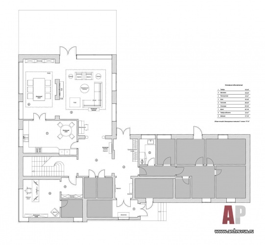 Дом имеет ясную, удобную структуру. Первый этаж занимают общественные помещения (центральный холл-прихожая, гостиная-столовая, изолированная кухня, кабинет хозяина), второй – две спальни, кабинет хозяйки и зона отдыха в холле. В мансарде организована зона отдыха с удобными диванами и домашним кинотеатром, а также гостевая спальня. Все помещения имеют хорошие пропорции и много естественного света.