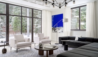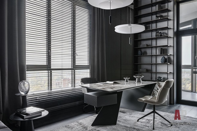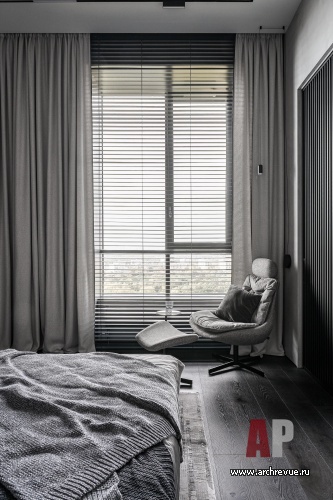 Тонированные в темно-серый цвет деревянные панели и фасады шкафов, напольная доска (широкая с красивой и четкой фактурой), а также темные жалюзи задают пространству правильный ритм и динамику. «Заказчица изначально хотела интерьер, где комфортно отдыхать, работать, принимать гостей, играть с питомцами. И не беспокоиться о быстром износе отделки и сохранности мебели, а наслаждаться природными фактурами, которые перекликаются с пейзажем за окном», - отмечает автор проекта.
