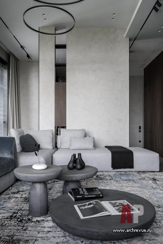 Сама дизайнер определяет стилистику квартиры как лофт-минимализм. Лаконичный дизайн, простая геометрия, монохромная палитра в оттенках серого и графита делает интерьер строгим и рациональным. Спокойная, природная колористика, натуральные фактуры дерева, бетона, камня, металла, ощущение основательности в мебели и декоре – таковы ее основные особенности. Здесь нет страха что-то пролить или уронить и испортить отделку раз и навсегда.