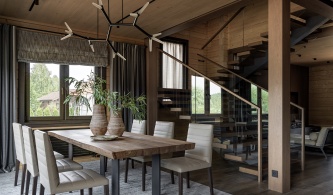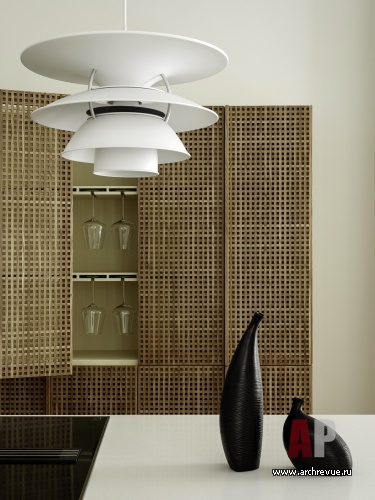 Кухня с островом, лаконичный двусторонний диван, функциональные низкие подоконники, кухня и остров сделаны специально под проект. «Наша гордость и любовь — это шкаф-бар с фасадами из массива дуба с мелким ритмом квадратов, внутри выкрашенный в нежно-лимонный цвет. Дверки складываются по принципу раскладушки, можно открыть отдельно верхние или нижние створки. И в этом тоже есть смысл – так как кухня небольшая, даже при большом застолье, баром пользоваться удобно», - отмечают авторы проекта.