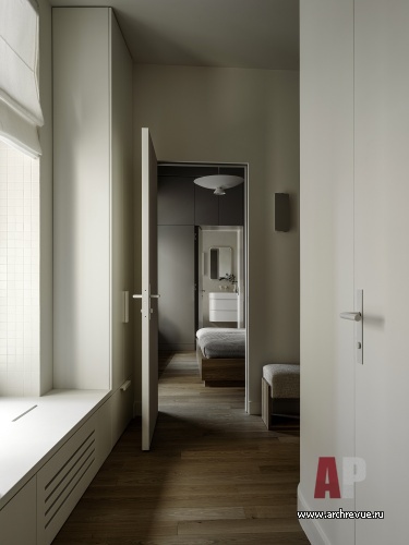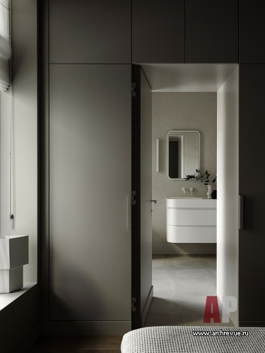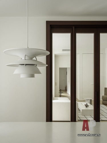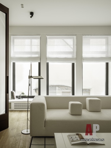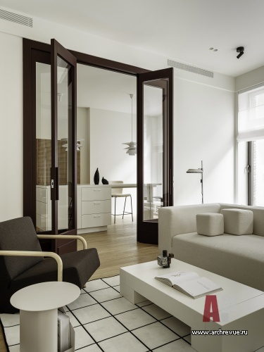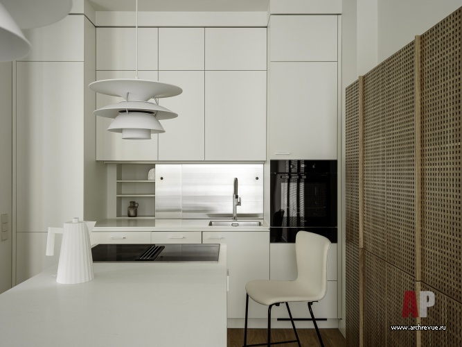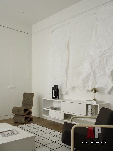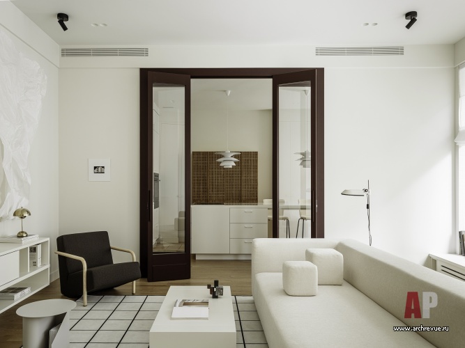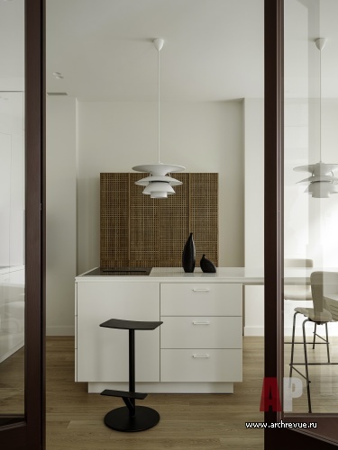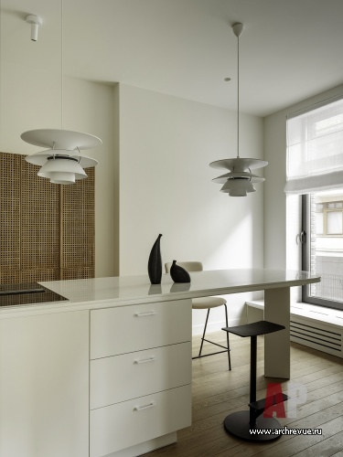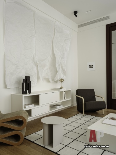 Квартира площадью 70 кв. м расположена в одном из корпусов клубного дома Artisan. Молодому человеку она понравилась своей локацией (тихие Арбатские переулки), размером и видом из окна спальни на шедевр конструктивизма. Именно памятник архитектуры 1920-х и вдохновил дизайнеров на проект: с чистой архитектурной формой, геометрическими объемами, тотальным белым цветом, контрастирующим со строгой и ритмичной отделкой дверей, оконных рам, бара. В итоге получился интерьер вне времени: эргономичный, с элементами сканди и ретро и эстетикой русского авангарда.