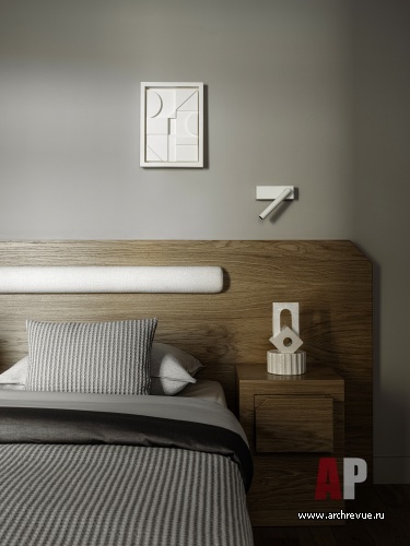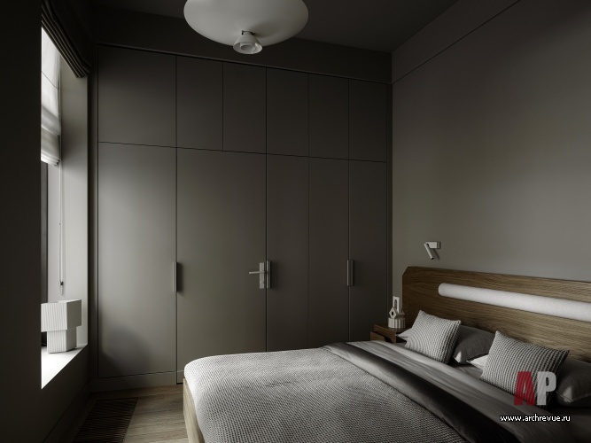 Спальня кровать, шпон дуба, на заказ, по эскизам дизайнеров; встроенные шкафы, на заказ, по эскизам дизайнера