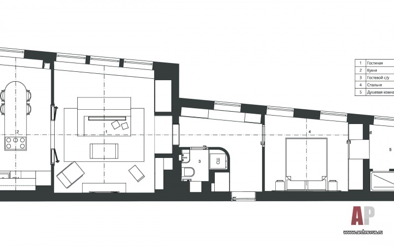 Осевое построение позволило максимально раскрыть пространство, впустить воздух, свет (плюсом стало большое количество окон, пусть и по одной стене) и создать идеальное жилье для активной жизни в центре города.