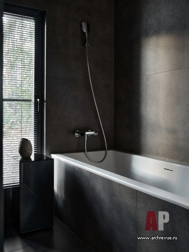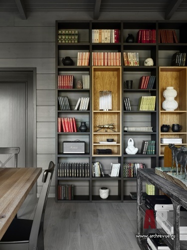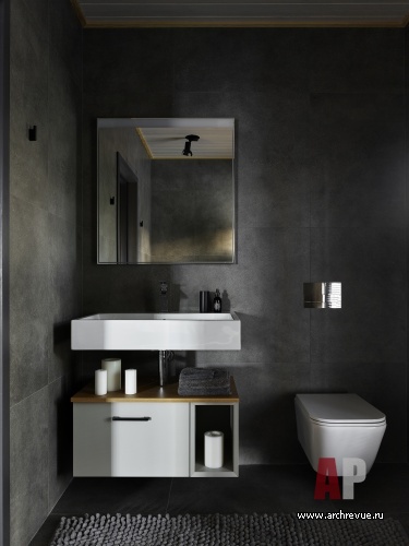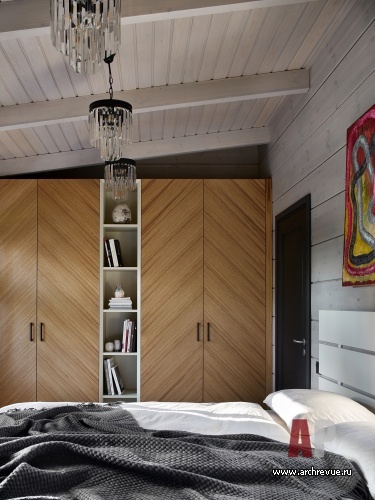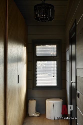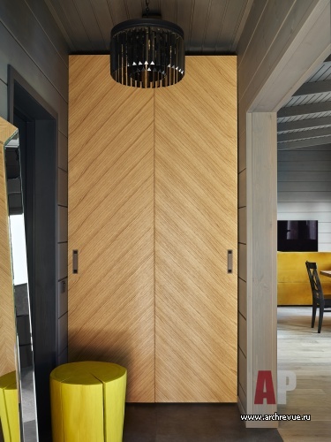 «Мы попытались создать интерьер, похожий на нашего заказчика: в меру брутальный, но не скучный, неожиданный и спокойный одновременно, - отмечают дизайнеры. – В нем много натурального дерева, поданного в современном исполнении». Краски интерьера спокойные, в выборе оттенков авторы проекта отталкивались от серого цвета и разбавляли интерьер цветными деталями. С фасада дом получился более темным, в интерьере же он сделан чуть посветлее: дерево и так сильно поглощает свет, хотелось не перетемнить.