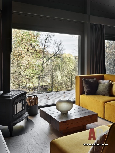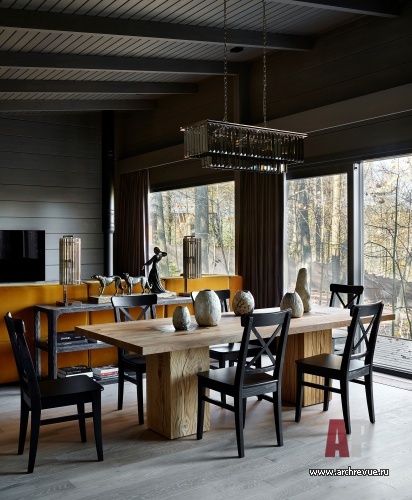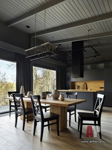 При проектировании она сделала упор на особенностях участка: вся часть панорамного остекления обращена на овраг, естественность которого заказчик хотел сохранить. Дизайнеры подключились к работе на стадии обсуждения архитектурного проекта и активно участвовали в выборе не только декоративных и строительных решений (окна, двери, отделочные материалы), но и архитектурных: площадь и расположение террасы, посадка дома на участке, тип фундамента (изначально планировался цокольный этаж). Такой комплексный подход позволил наилучшим образом реализовать все пожелания требовательного заказчика и создать индивидуальный интерьер, который по-настоящему отражает личность владельца.