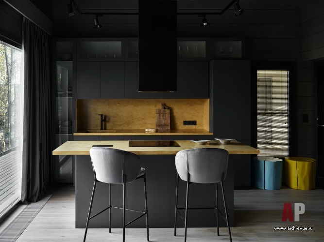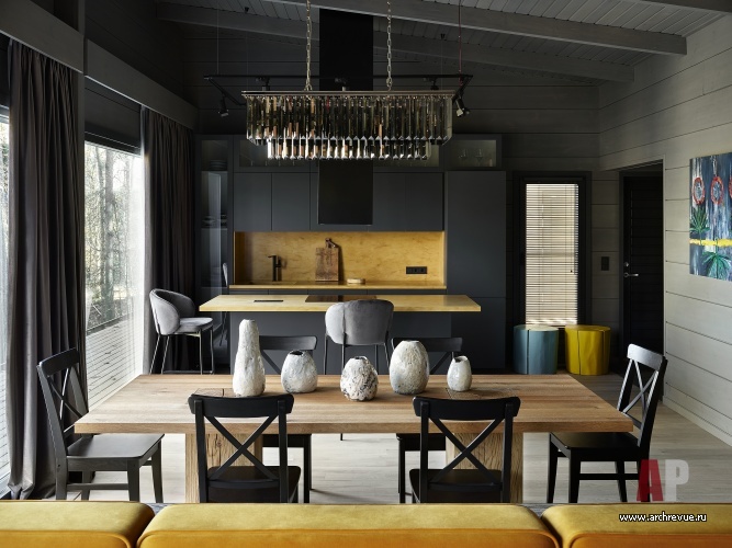 Заказчик – молодой бизнесмен, любит отдых на природе, ценит естественную красоту и комфорт, в деталях предпочитает стилистику ар-деко. Ему нравится природная фактура дерева, сдержанность и монохром (первоначально интерьер вообще планировался черно-белым, но уже потом появились яркие цветовые акценты – горчичная обивка дивана, столешница из камня и фартук на кухне желтого цвета).