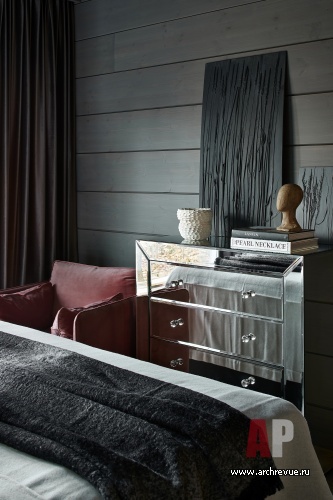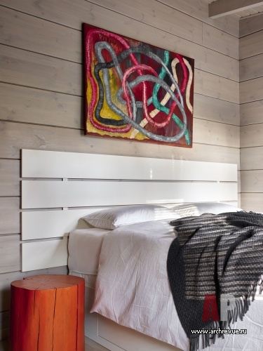 Его декоративное наполнение – это микс предметов как дорогих фабрик, так и очень бюджетных. Но везде использованы только натуральные материалы и богатые фактуры. Значительная часть предметов, в том числе все кровати, диван и кухня выполнены по эскизам дизайнеров московскими мебельщиками. Они же изготовили эффектный журнальный стол из толстых бревен и пни из кедра (их 15 штук!), отшлифованные вручную и покрашенные в разные цвета они есть во всех помещениях, что еще больше подчеркивает природную сущность проекта.