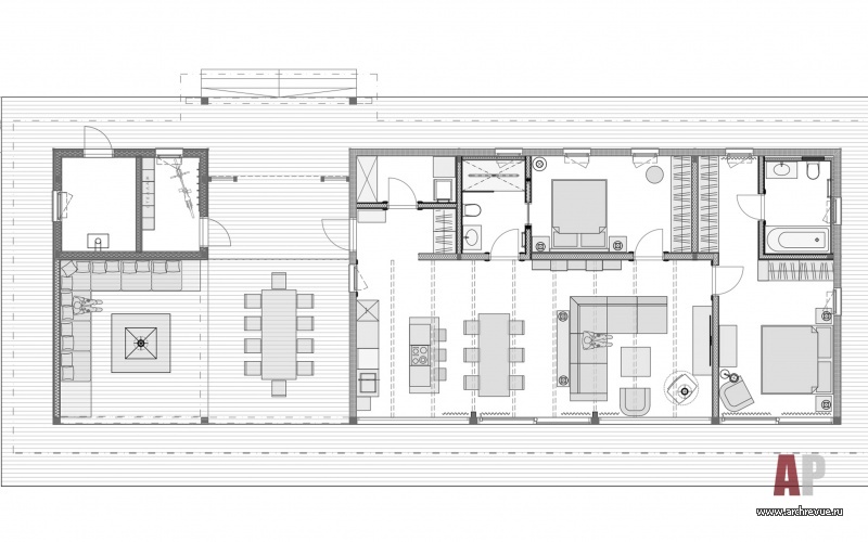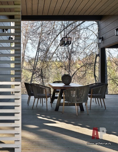 Одноэтажный деревянный дом построен из безусадочного бруса. Его общая площадь составляет 270 кв. м, из них 100 кв. м – жилая, а 170 кв. м – площадь террас и технических помещений. Центральный объем дома занимает общая гостиная-столовая-кухня, зоны выстроены по одной оси вдоль панорамных окон.