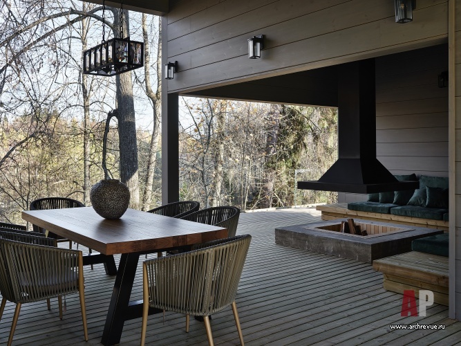 Заказчик дизайнеров Марины Пенние и Романа Воронова – занятой серьезный мужчина – хотел построить комфортный деревянный дом для проживания за городом с минимумом декора, большой зоной для приема друзей и гостей, зоной BBQ на улице и открытым кострищем на веранде. За индивидуальным проектом он обратился в компанию Honka, архитектор Светлана Веселова-Беднякова разработала проект одноэтажного дома: рационального, компактного, с большой верандой под крышей.