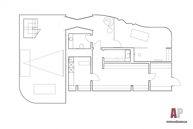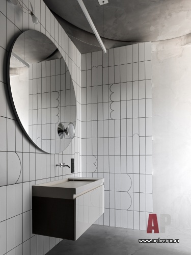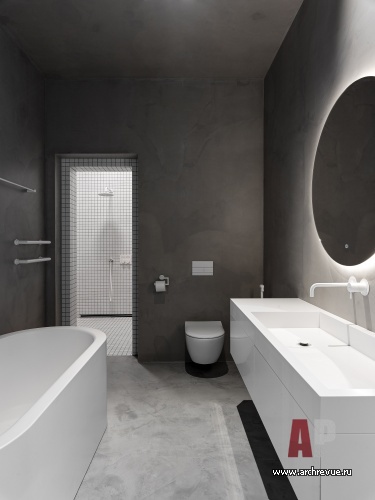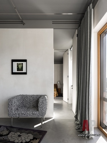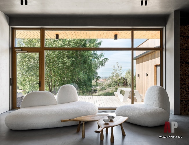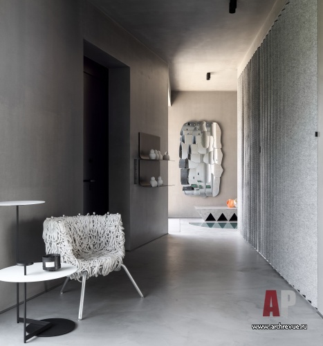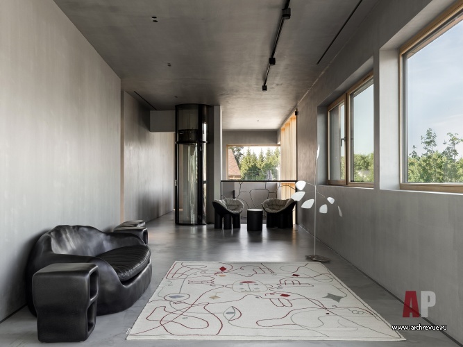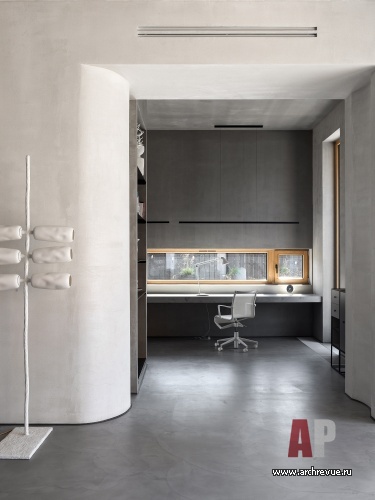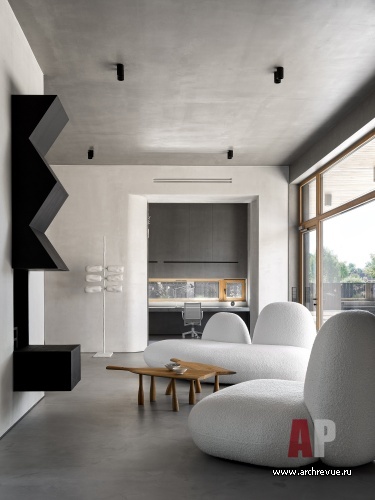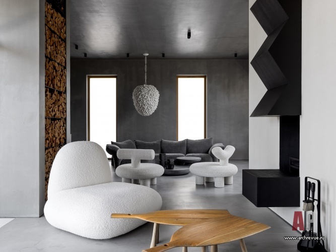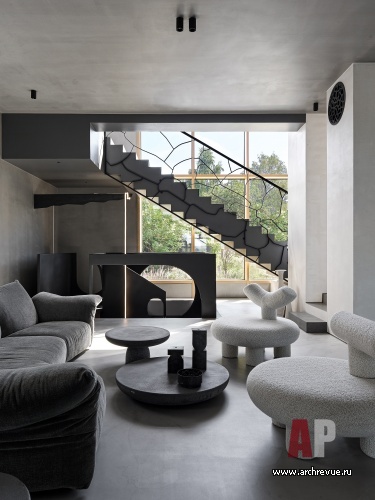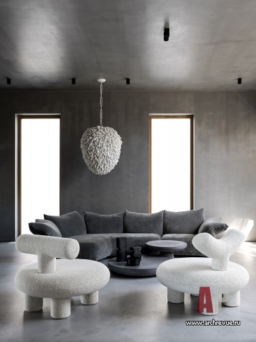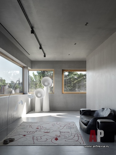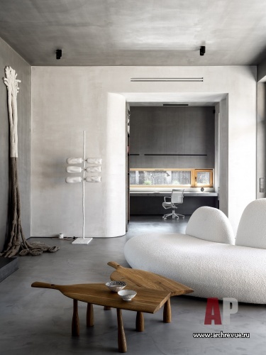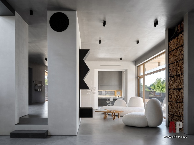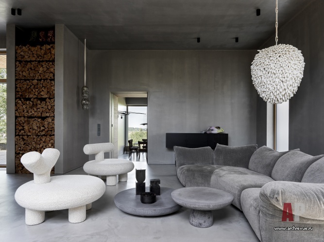 Полностью бетонный дом с деревянными окнами, природными формами и арт-объектами – такова основная идея проекта. «Нам было важно сохранить ощущение пустоты, недоделанности, незаконченности», - рассказывают архитекторы. Хотя в доме был проведен серьезный ремонт: качество исходного бетона не соответствовало, его заменили современные штукатурки и микроцемент со сходной фактурой; в объем была внедрена инновационная инженерия, притом так филигранно, что сами устройства не видны глазу.