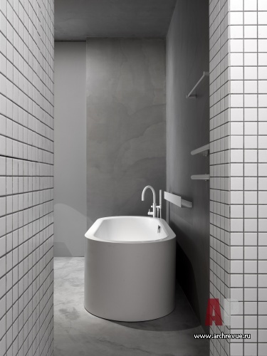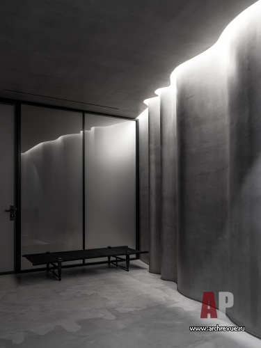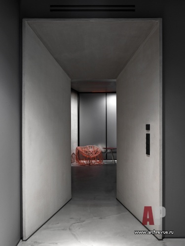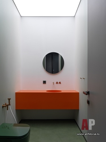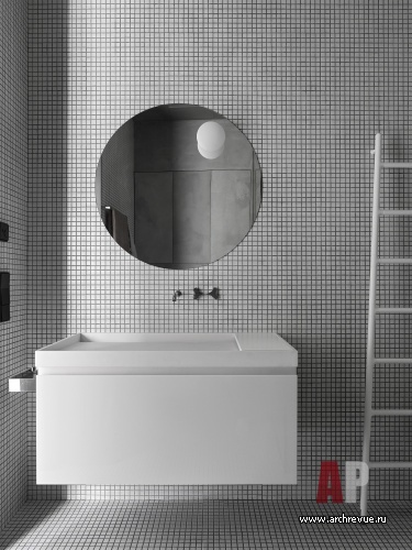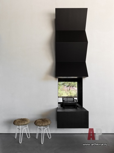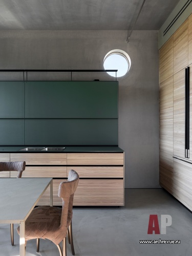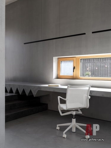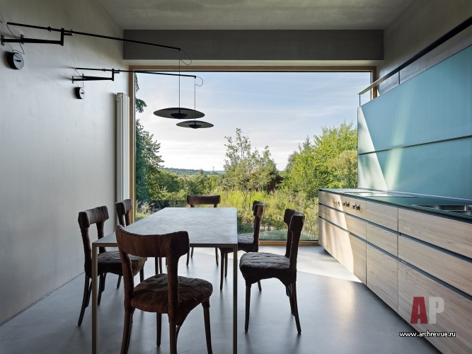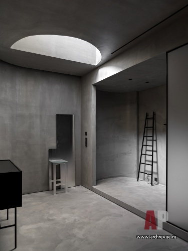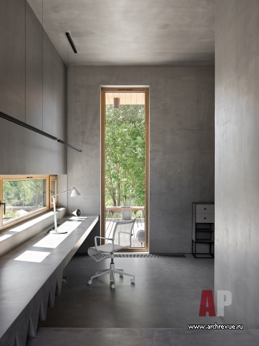 Его пол, стены, потолок – все из бетона, в бетонную коробку вставлены выразительные деревянные окна, из которых открывается вид на дикий сад. «Этот совершенный в своей лаконичности образ вдохновил нас ничего не менять, оставить все как есть», - рассказывают архитекторы бюро.