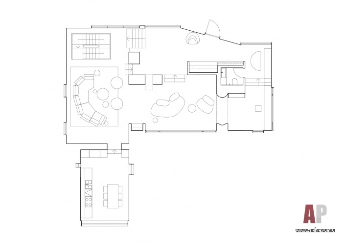 Пространство дома организовано на трех уровнях: одном подземном и двух надземных. Внизу находится развлекательная зона с кинозалом, массажной комнатой и зоной отдыха. Первый этаж занимают парадные общественные пространства со сквозной планировкой и природными видами за панорамными окнами.