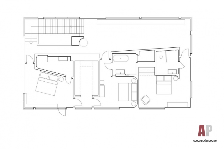 Верхний уровень – приватная территория с общей галереей и тремя спальнями, каждая со своей ванной комнатой. Все они имеют нестандартную конфигурацию и текучие, округлые формы. Уровни соединяет авангардная лестница, одновременно и гигантская скульптура, и сложная инженерная конструкция. Она висит на перекрытии и едва касается пола. К объему дома примыкают открытые террасы, они полностью стирают рань между интерьером и экстерьером.