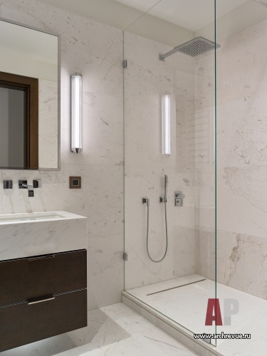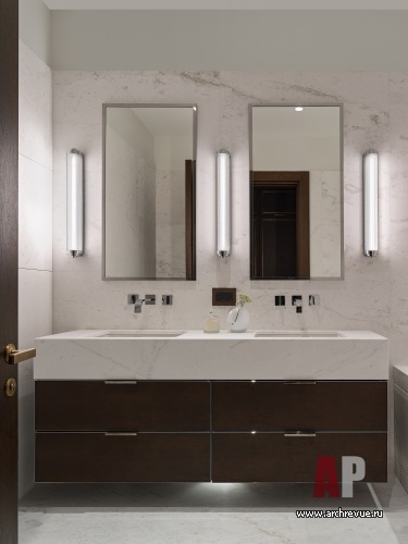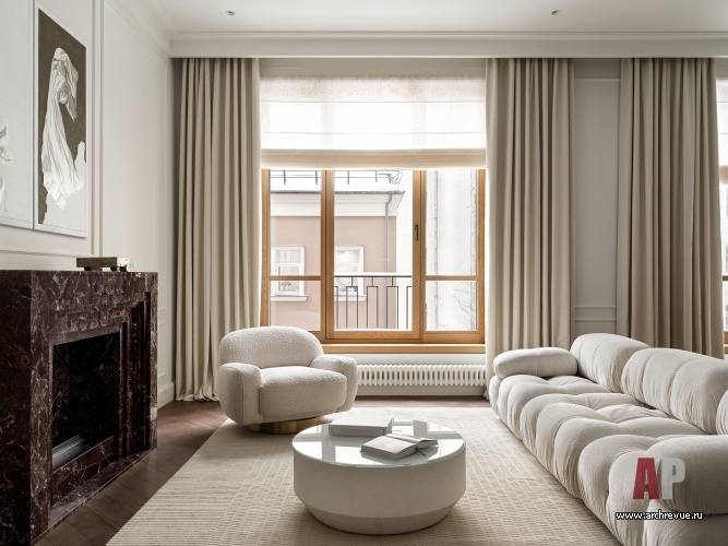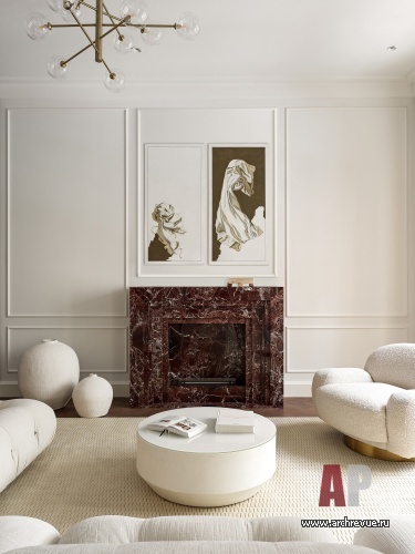 Хотелось легкого и светлого интерьера без большого количество встроенной мебели. Плюсом стало то, что клиент не боялся ни белых диванов, ни светлых ковров. Основная палитра проекта – приятные молочные тона: в светлые цвета окрашены все стены, часть мебели, мрамор в санузлах. Ощущение легкости и хрупкости пространства усиливает темное дерево и мраморная отделка портала камина.