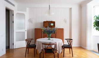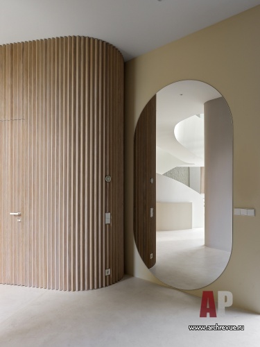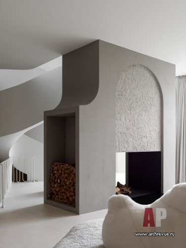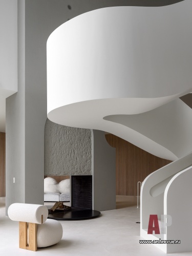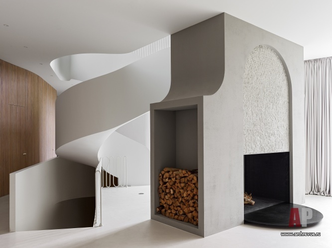 Архитекторы бюро Le Atelier спроектировали современный дом, в котором практически нет углов, все линии текучие и сглаженные, а бетонная лестница напоминает гигантский серпантин. Как вспоминают авторы, история проекта началась с огромной, невероятно красивой двухсветной пустоты в центре бетонного дома. Сам дом заказчики приобрели в поселке, архитектуру которого можно было бы определить как «плохой модернизм».